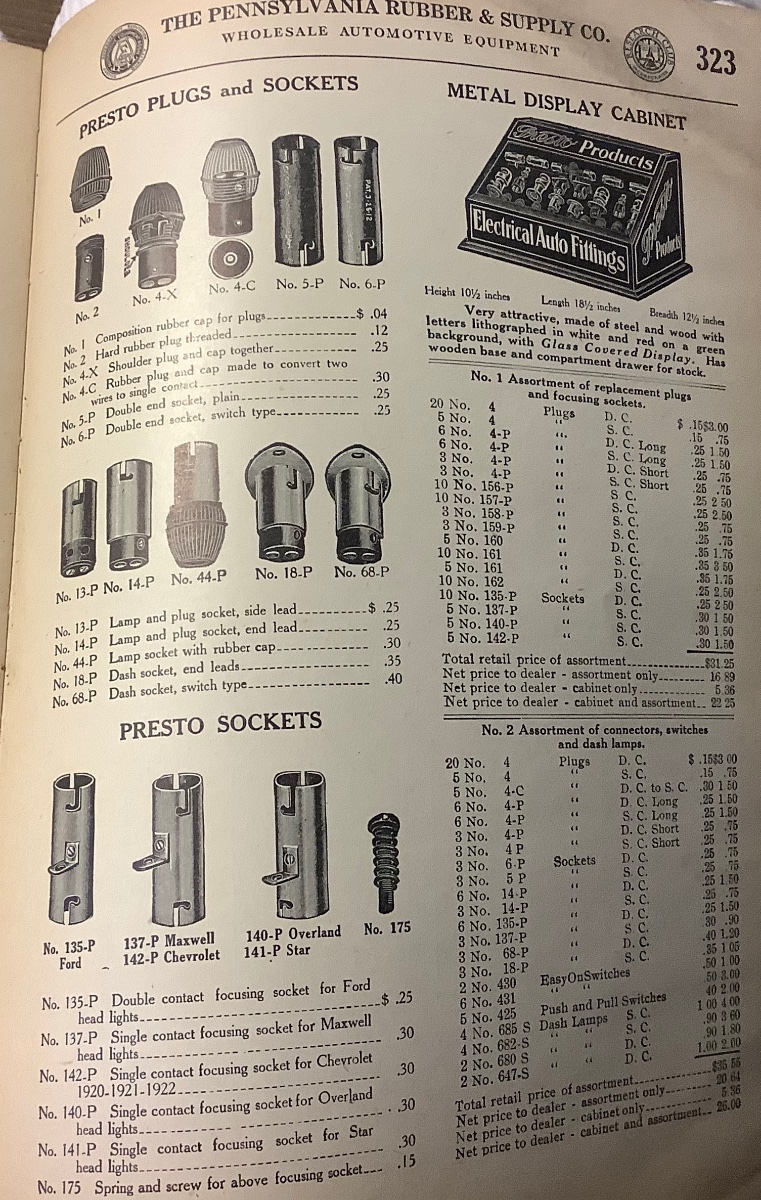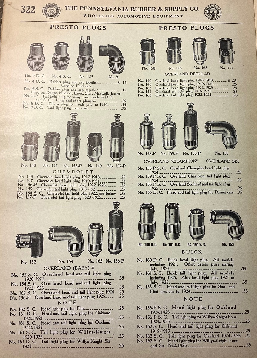 Going through all my original head light and tail light plugs I ran across this Presto single contact plug and socket combination, very cool