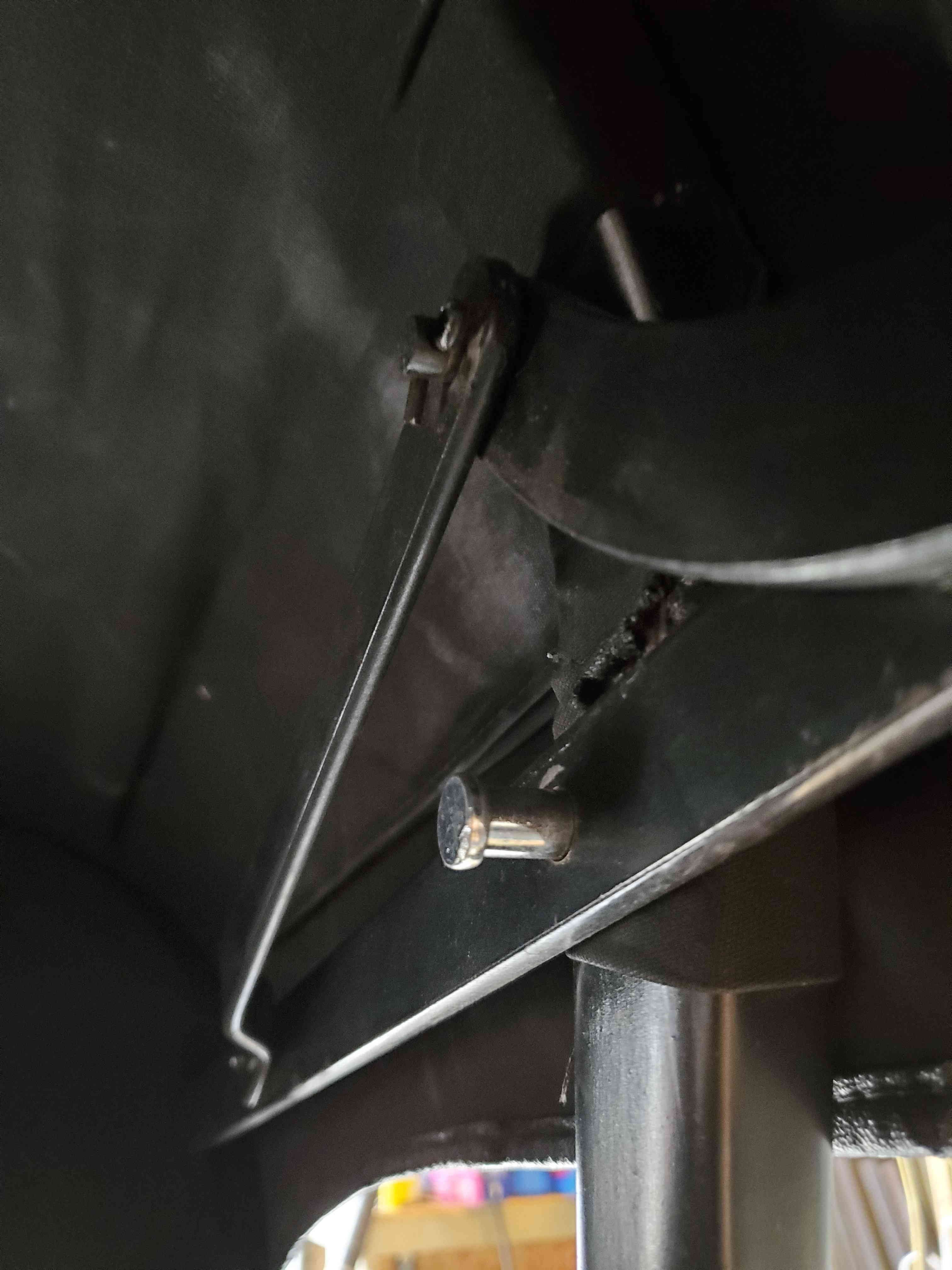 If what are being called pins are really the winged bolts and the bow covered with fabric is the front header bow, could be the top clamp brackets are missing.