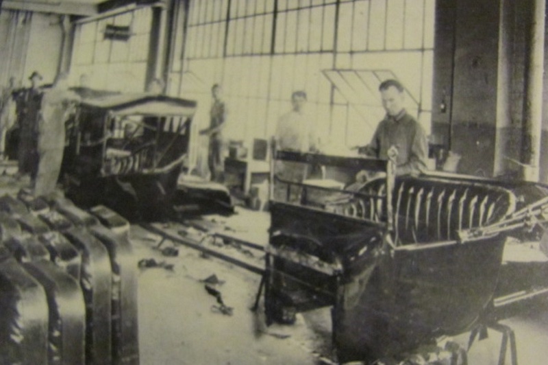 Later assembly with parts stacked on left of line, note the top irons with covered bows, then behind boxes of cut and sewn ready to fit top covers, as the body moved the top was assembled.