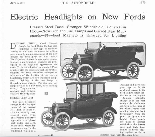 This article in April issue of Automobile, is announcing the new open cars 1915 with electric headlamps. The opening sentence says Ford had been delivering this new model for 'a little over a month', meaning likely the new version was introduced perhaps in Feb, maybe not Jan.