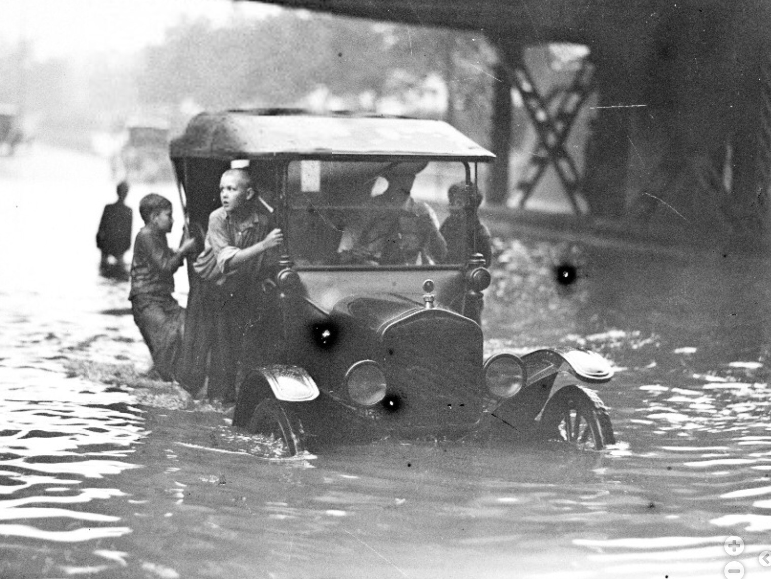 Everyone hanging on that car looks thoroughly soaked and has the post-disaster "100 mile stare" on their faces... bet they remembered this the rest of their lives.