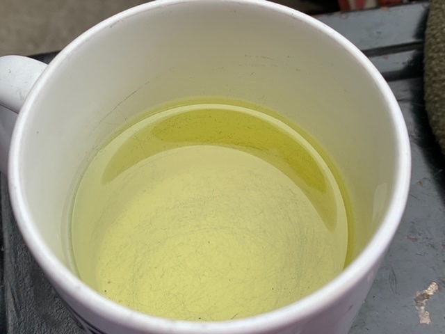 I decided to see if the discoloration (and possible contamination) was coming from the tank or was only in the carb bowl. I drained the carb bowl completely and then began filling another cup with gas I knew was fresh from the gas tank and had only passed through the carb. That gas looked good.