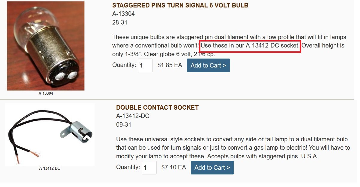 Many dual filament bulbs have straight/parallel pins. such as the model T headlight bulbs. I have what appears to be a original 1926 tail light / stop light. It has a clear window for license plate lighting. it uses two single base contact bulbs with parallel pins. one high wattage bulb for stop and a lower wattage bulb for tail light. two straight through sockets that use headlight type single pin connector. I understand Stop lights were available on 26 /27 model Ts with the brake switch that mounts on the starter Bendix. The 1157 type bulb has off set pins and the 1156/1158 have parallel pins. dual filament automotive bulbs weren't introduced until the forties ?