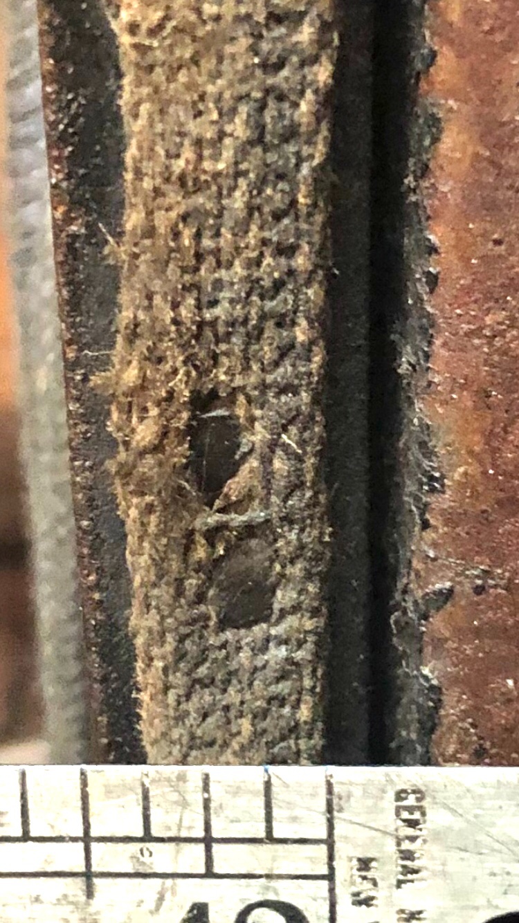 Close up of 1923 original low steel dash (firewall) lacing, the split rivet tang is folded into the lacing. Head of rivet on metal underside. Just like tranny band lining install.