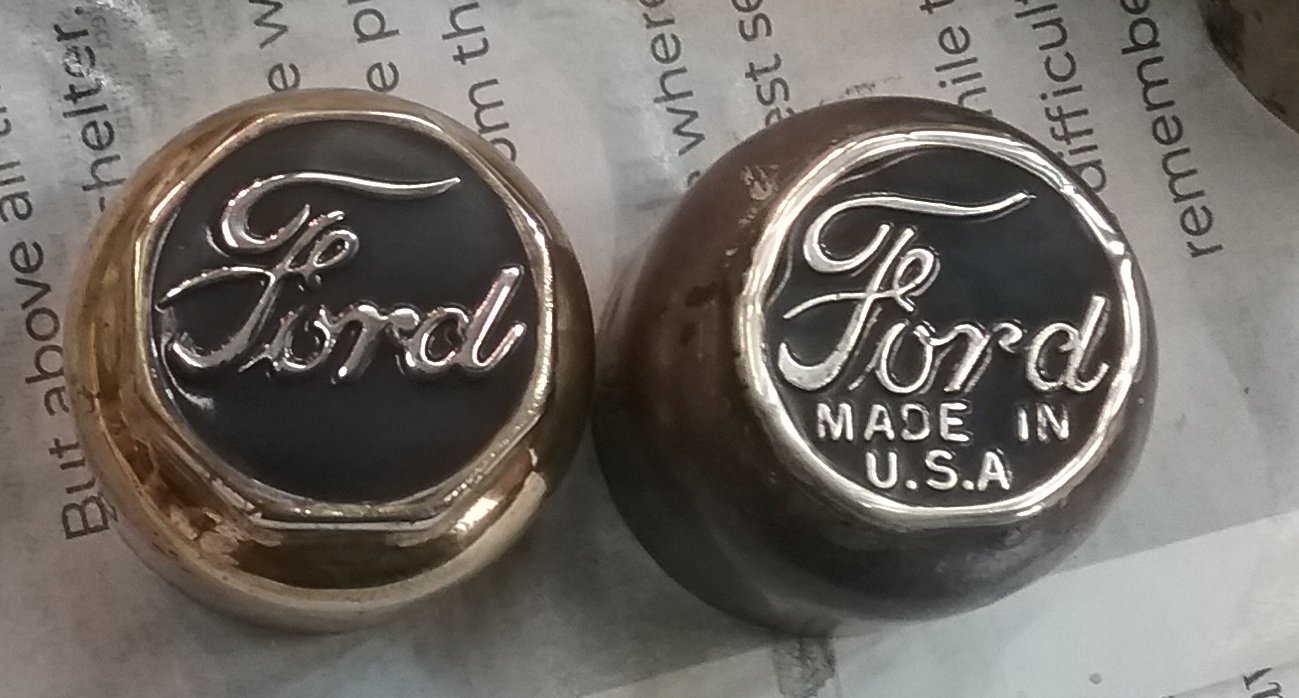 OK fellows, I recently found a brass hubcap with the usual Ford script as shown in the first photo, BUT, there is no raised rim around the perimeter. The Ford script is simply stamped in the flat ens of the hubcap. Your thoughts appreciated.