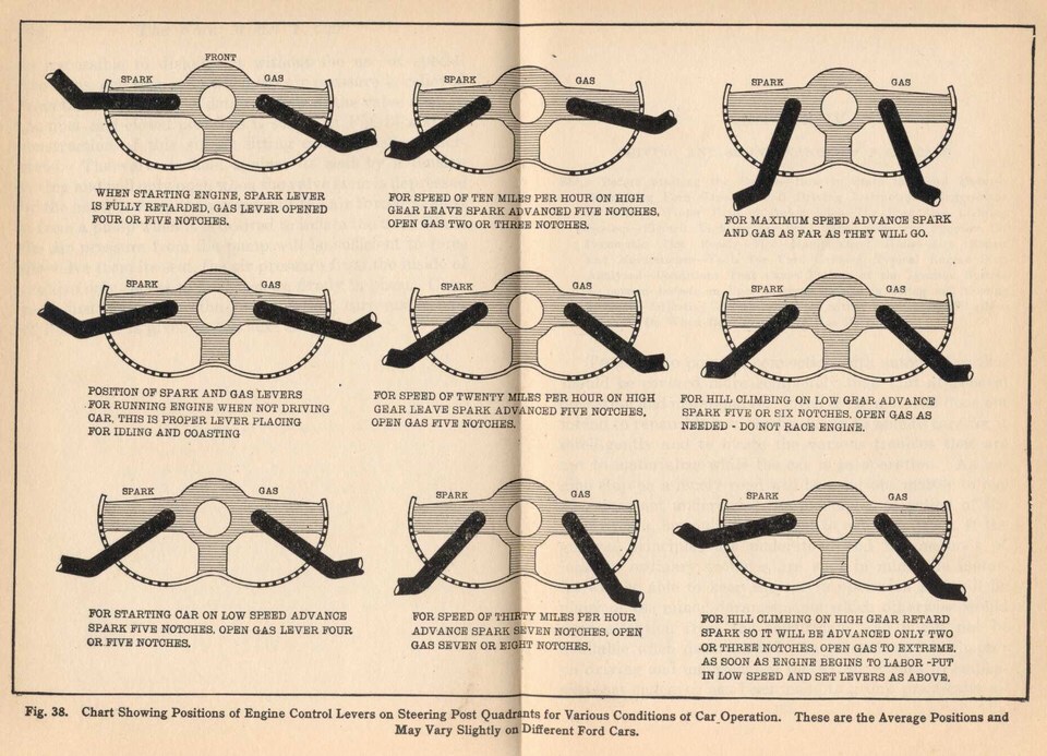 The chart Jim posted showing many different throttle and spark lever positions applies to running on battery. When running on magneto there are only three spark positions. It's customary to start on battery and switch to magneto, in which case you can forget about the chart. Just move the lever down to where the car runs best.