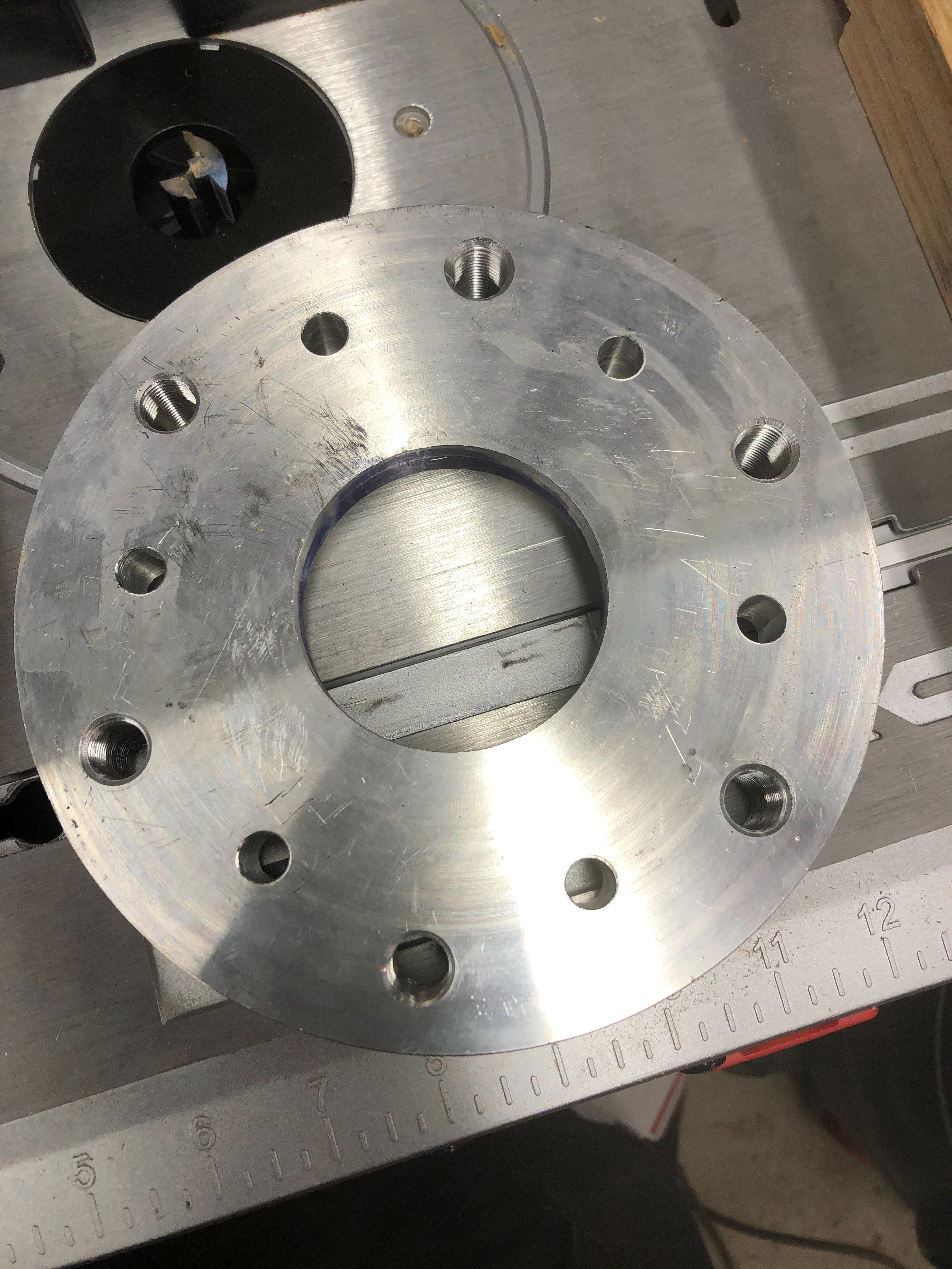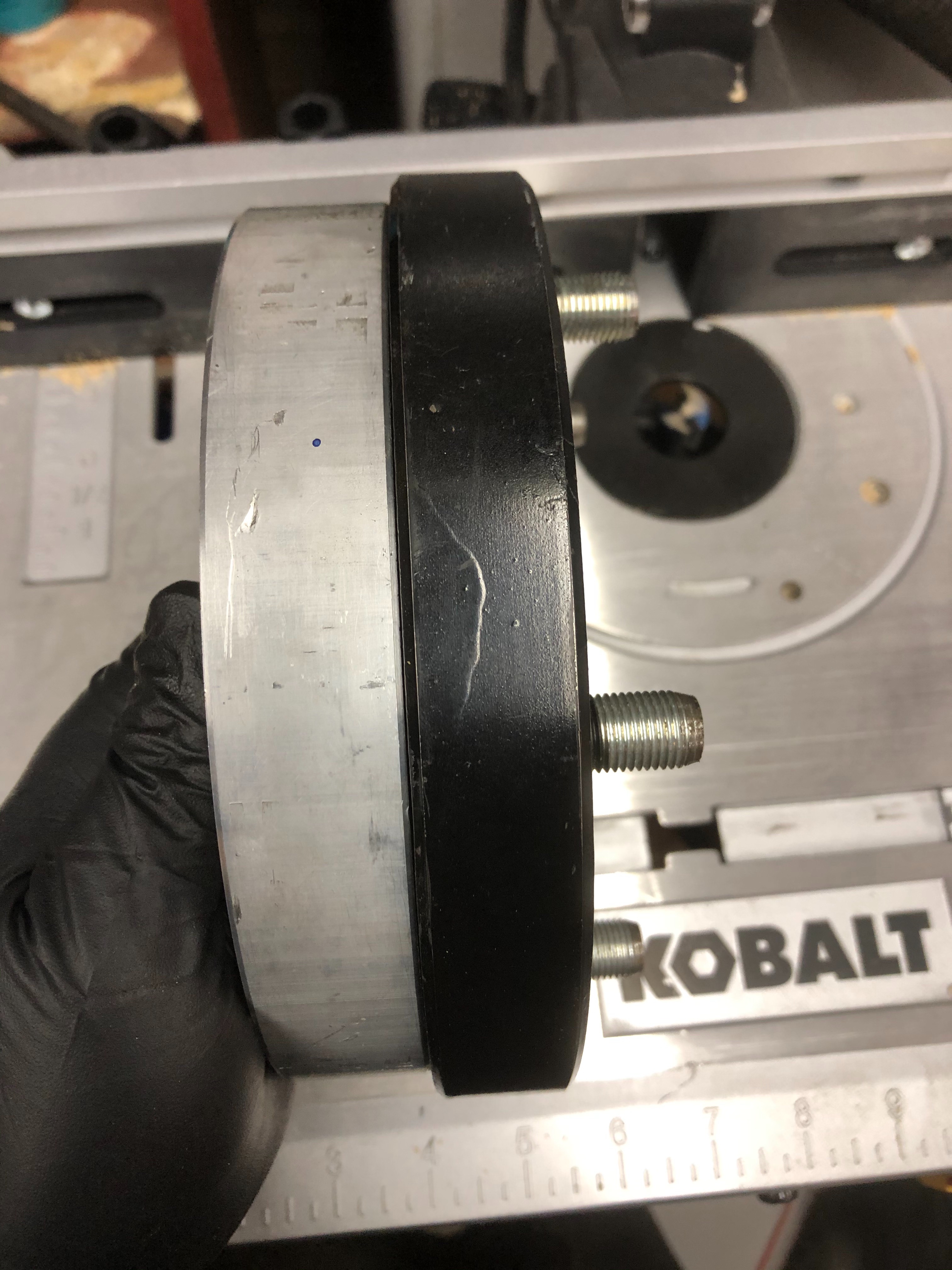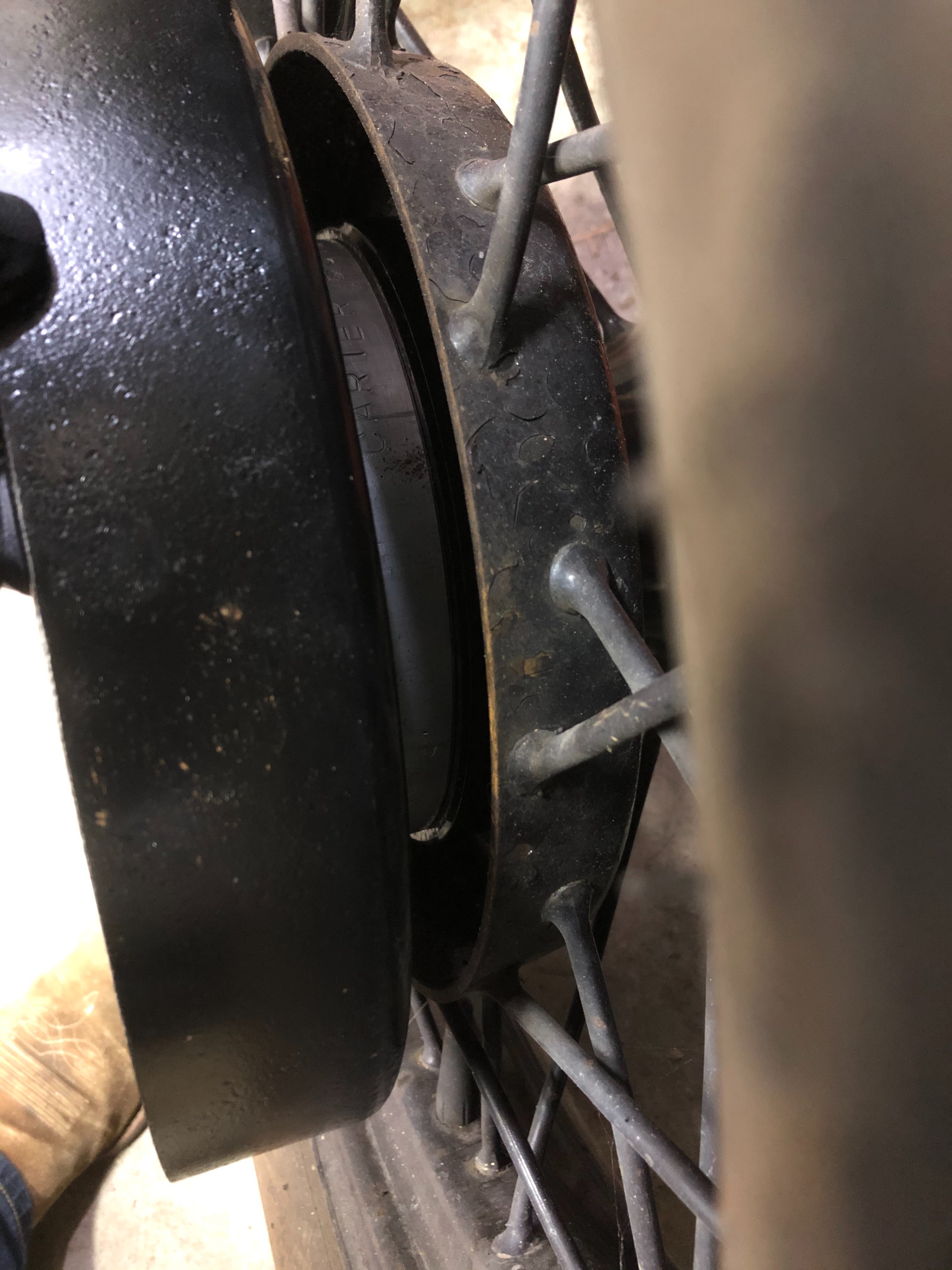 I think I’ve solve my problem that is a terrible supply of 20” TT wheel parts. When I got my 27 TT the rear wheels were in terrible shape. Namely the rims. I’m pretty sure you could read the news paper through most of the rust holes. So I thought I’d just get a better set. Now I’m positive that rims in good shape are made of unobtanium. I found a very nice set of Model A 19” wire wheels at a steal on an unrelated parts trip and then the gears started turning. I know adapters were already available for T wood hub to A wire wheel but nothing for the TT so with that information I set off on my own personal project. What it now boils down to is, with the help of my buddys machine shop, I have successfully adapted Model A wire to the TT rear hub. The A wires are a stronger wheel and 19” tires are way cheaper than their 20” counterparts. I can still get big 19” truck tires to fit the wheels but the tires that were on the wheels are very nice Firestone white walls so they’ll do for a while until I want to buy bigger tires for the rear to match. I’ve also made the plate thick enough to push the hub far enough away from the wheel to run disc brakes without interference or sacrificing structural integrity or safety. Once I’m done with the mock-up it’ll all go back together with loctite and lock washers to ensure nothing tries to come apart.