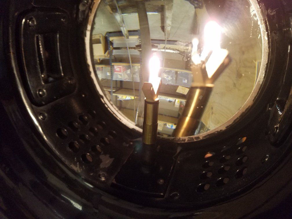 I was pleasantly reassured that the light the gas provides is ample and it really is as good as the bulbs were. The lamps don't flicker or hiss. The flames do vary in size a little bit, though; sometimes the flames are the size of a dime and other times they are the size of a quarter. The car was in the shop while I conducted this experiment and the chimneys smelled like hot stuff. Scorching polish residue? Fingerprints burning off? Hot brass? I dunno, they just smelled hot. They took on a very faint rainbow effect, too, but the rainbow colors polished off the chimneys with no effort at all.
