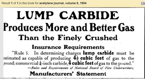Carbide produces about 4 cubic feet of acetylene gas per pound.