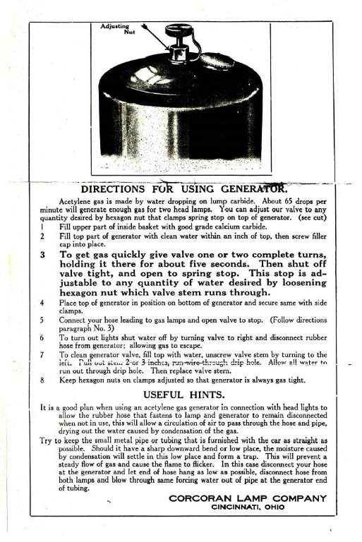 I have a car with a Prest-O-Lite tank and you are right! They are much easier, cleaner and instant. I am a Prest-O-Lite fan! I considered putting a tank on this car but the generator was in mint condition (probably N.O.S.) and it was begging to be used. And like I said, I had deconverted a car before and it was an adventure - it also had a carbide generator. I remembered washing out the generator and it is a stinky, messy chore. But I don't care (for now). After I've done this for a while, I know myself well enough to realize there will probably come a day - or evening - when it will suddenly not be any fun and it will have become a pain and the next day there will be a tank where the generator currently is.