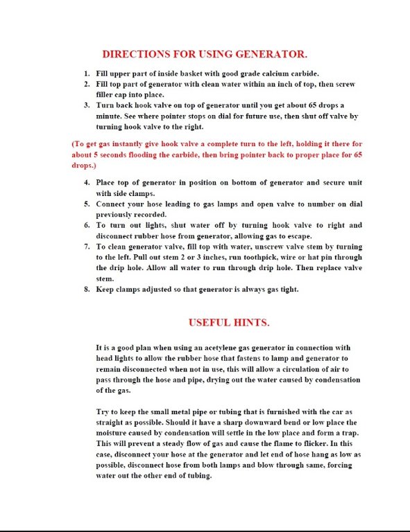I'm new to using gas headlights. Because of dedicated members, I was able to duplicate all of the gas lines for my car to original style. I was able to find a brass Tee for the radiator, and for the first time in my life learned how to do a double flare! My only wish now is for Ron Gocek to get busy and make the correct red tubing for our cars again. Oh, by the way, the headlights worked fine, so good in fact, I did my '13 touring next!