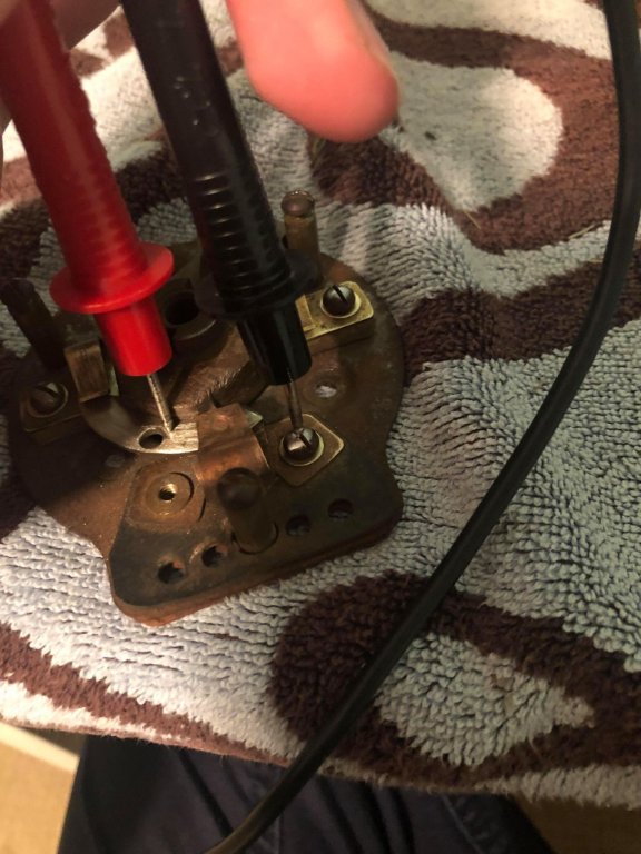 I then went ahead and cleaned up the contacts as much as I could in the switch as seen here: I cleaned as much surface as possible without removing the rivets, including where the mag and bat terminals are, and the large switch contact. The place I couldn't get was under the contact with the terminal connecting to the bottom strip of the coil box. For fun, I tested the conductivity, and low and behold, I once again reached 0.3 ohms in this position. To my surprise, in the opposite position, I actually reached 0 ohms (my meter goes to the tenth, so less than 0.05ohms). Going all the way across to the last terminal however, it hovered around the 1.0 ohm range. This is likely due to the face that I can't get my emery cloth under the last contact.