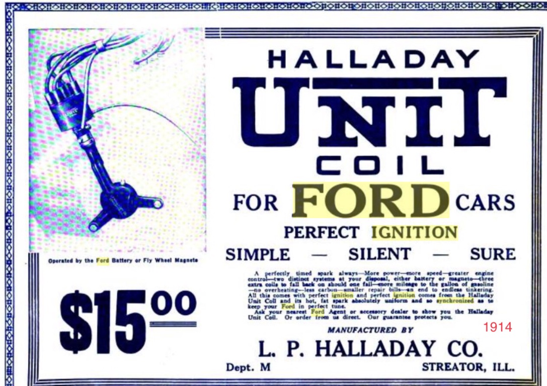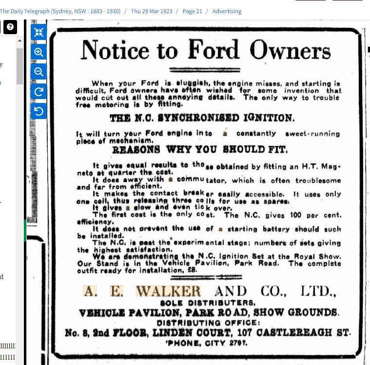 An advertisement for a "better" ignition system for a Ford was being advertised in Australia in 1923. Called a N. C. Synchronised Ignition.