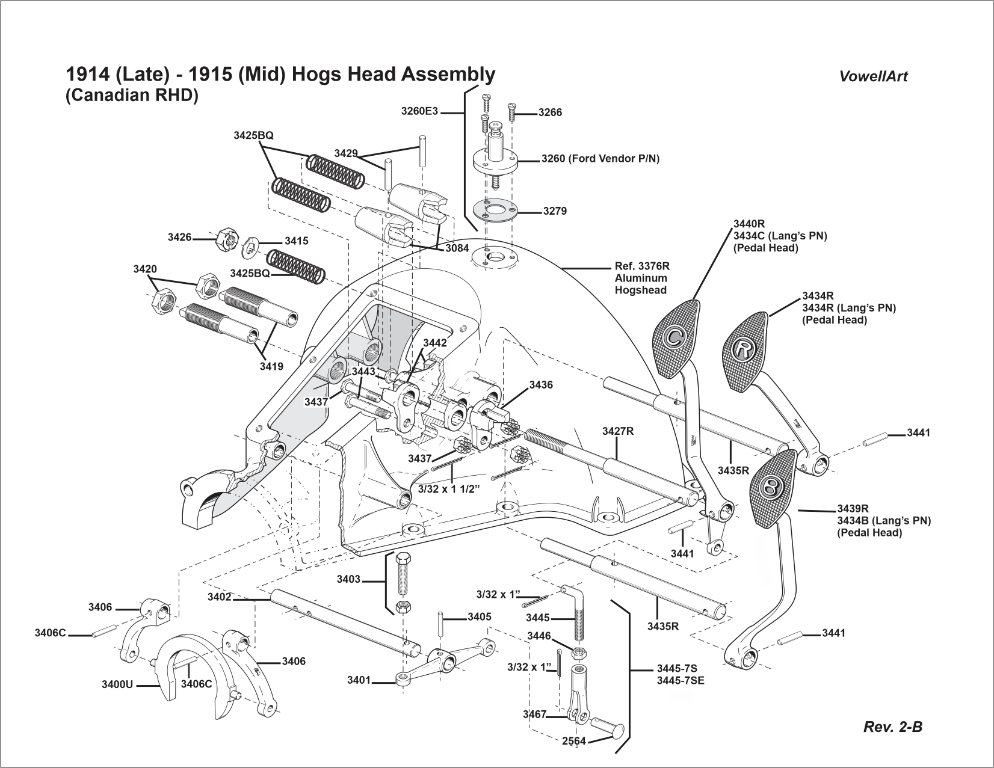 I had to remind myself that I'm not trying to tell anybody HOW to put any of my assemblies together (even though it is a great temptation), just which parts go with it and where they go when assembled. Which is not the same thing as telling someone how to put them together. Those 3 parts ARE part of this assembly and SHOULD be shown as such. On the next drawing where this assembly gets button up to the pan, I can again show these parts and how they fit in relation to the bands ears....so, why was I screwing around omitting them in this assembly? Best to have all the information as to part numbers on the same page so somebody doesn't have to go skipping around looking for the few parts I've omitted thinking that it can only be shown once you start fitting major assemblies together.....so, here's Rev 2-B.