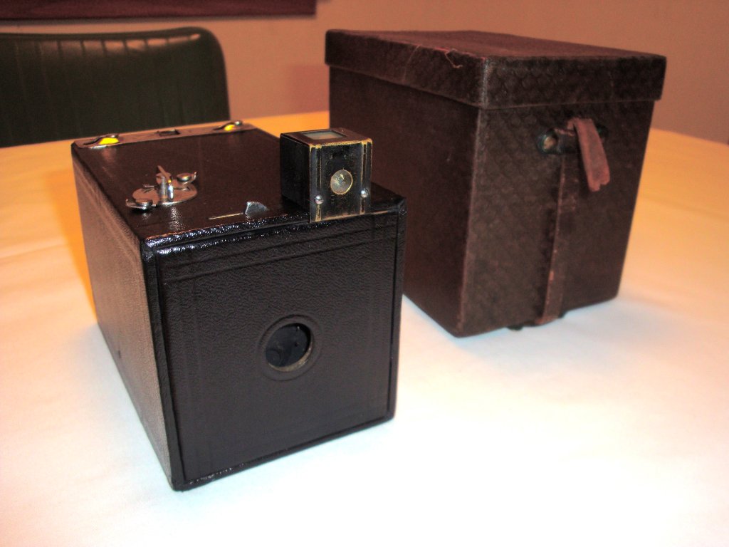 If John's camera is a 120 it's still usable. Other film sizes (116, 122, 124, etc.) are long gone. It has only a vertical viewfinder. Many box cameras, like the #2 Brownie, have another viewfinder for horizontal shots. #2 even has some limited aperture adjustment and a time exposure setting.