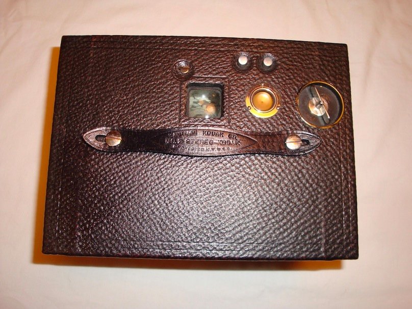 That was the original Kodak camera of 1888, it came preloaded with a 100 exposure film roll. You sent the whole camera back to Eastman for processing. http://camera-wiki.org/wiki/Kodak_Camera The cool thing about those was that the photographs are round. The Brownie came out in 1900, and the no. 2 Brownies were made from 1901 until I think about 1932. Box cameras in bewildering variations were made until at least the late 1950s.