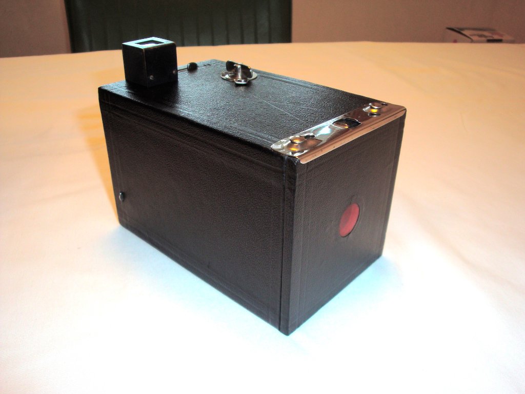 If John's camera is a 120 it's still usable. Other film sizes (116, 122, 124, etc.) are long gone. It has only a vertical viewfinder. Many box cameras, like the #2 Brownie, have another viewfinder for horizontal shots. #2 even has some limited aperture adjustment and a time exposure setting.