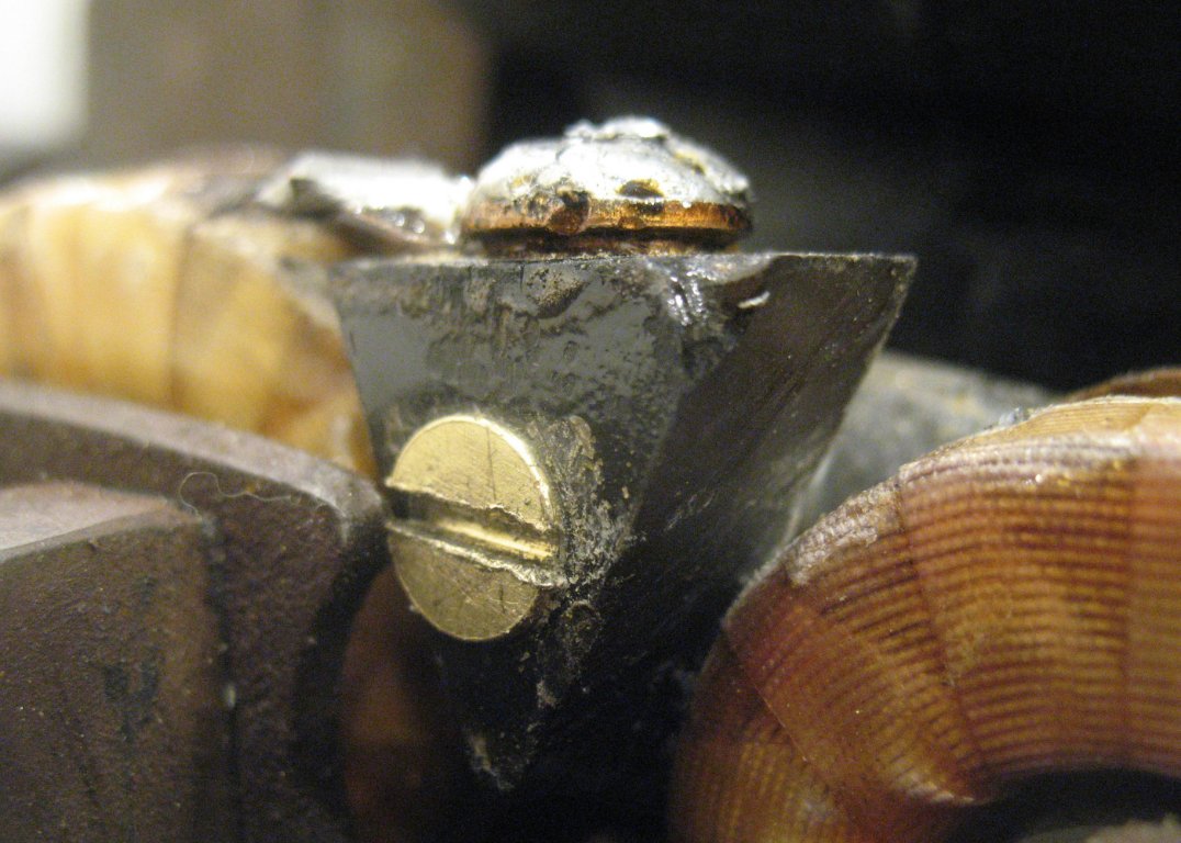 This view may show better what's going on. The triangle as originally installed had the solder blob too far forward, so it was not centered in the mag post hole. When I moved it toward the rear to center it in the hole, the screw wasn't countersunk in the triangle enough. Here you can see the magnet plate hitting the head of the screw. I will be making a better triangle that will position the blob correctly without a screw head sticking out.