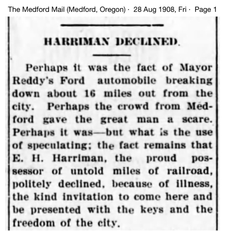 So, the good mayor has a large motor car, and is quoted in this July 1907 article about the large per capita number of cars in Medford: