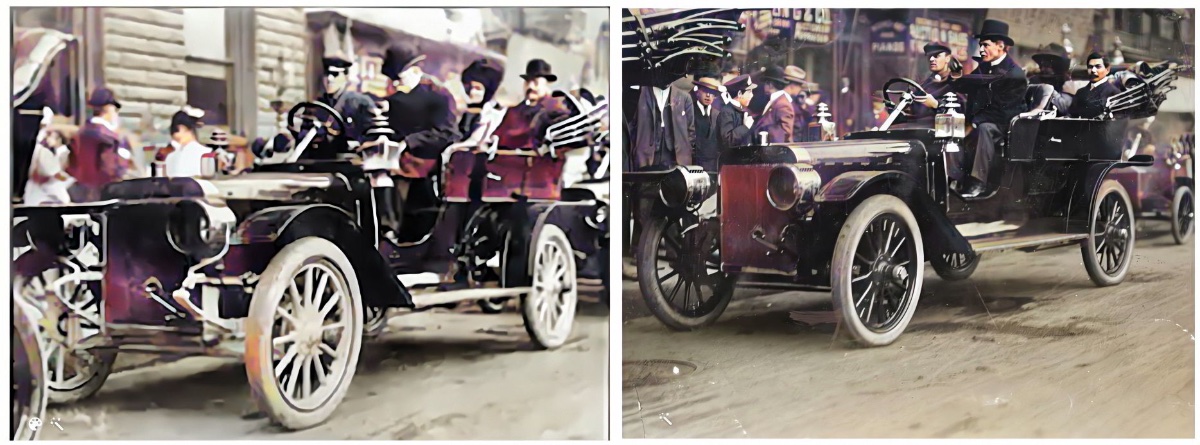 Both photos colorized, and placed together. My guess is these are Ford cars lined up and demonstrating, maybe at one of the many auto shows: