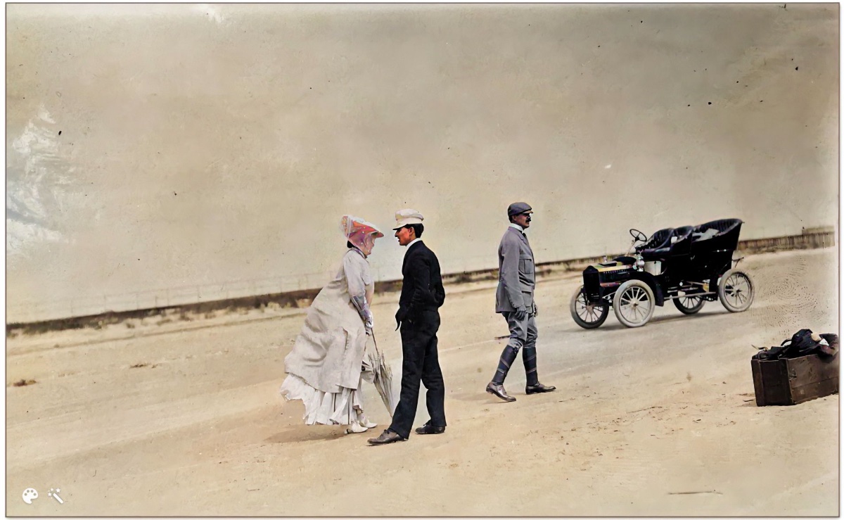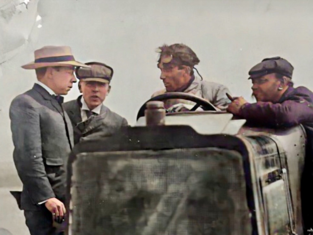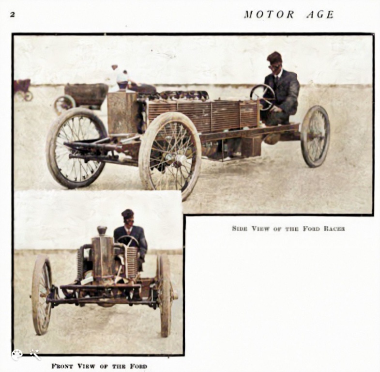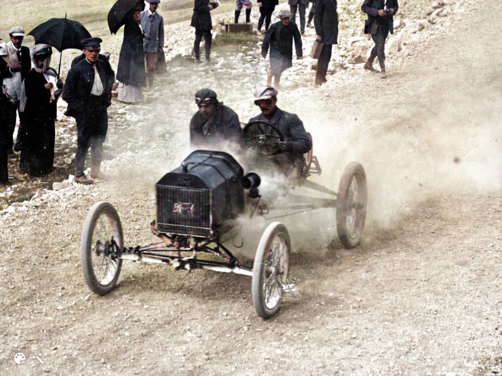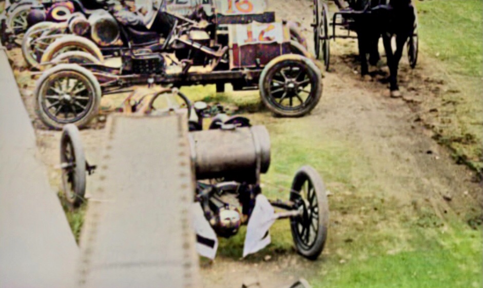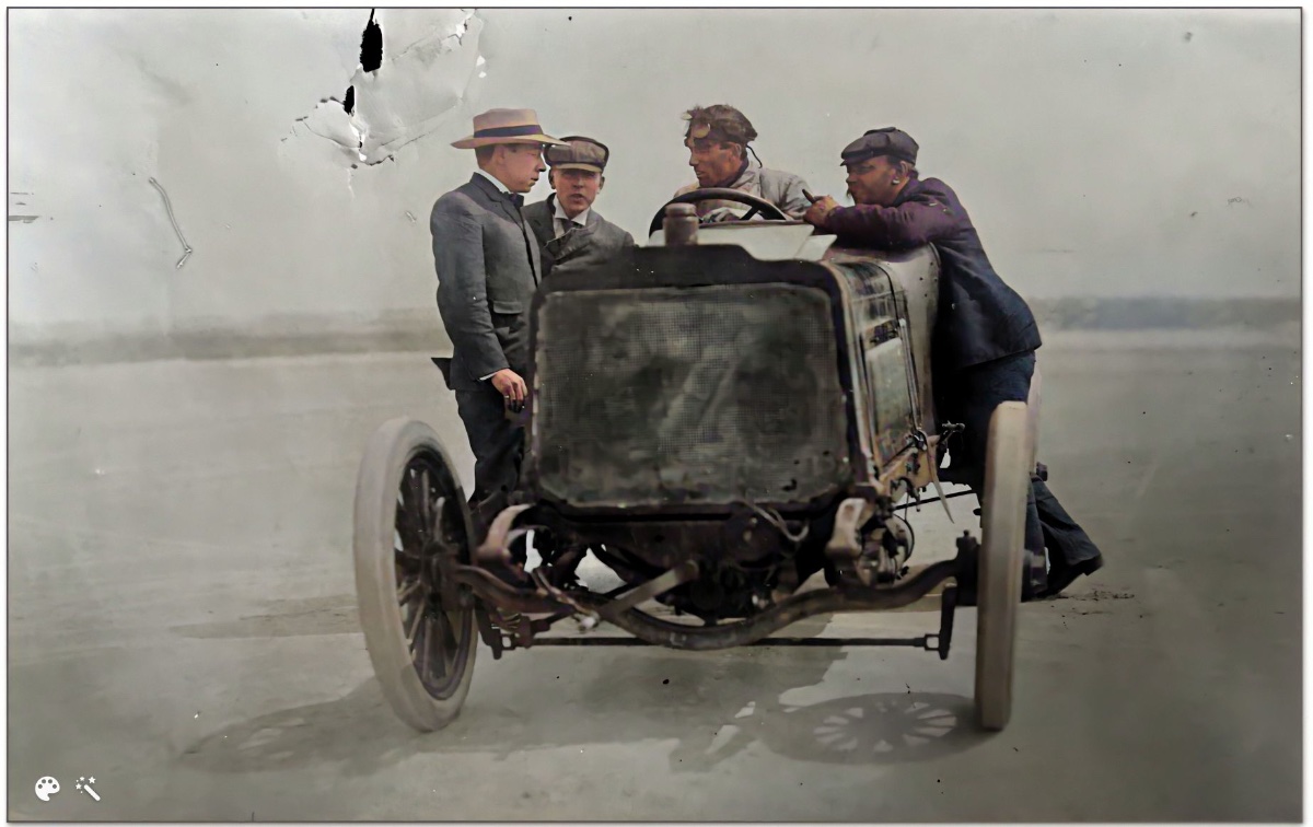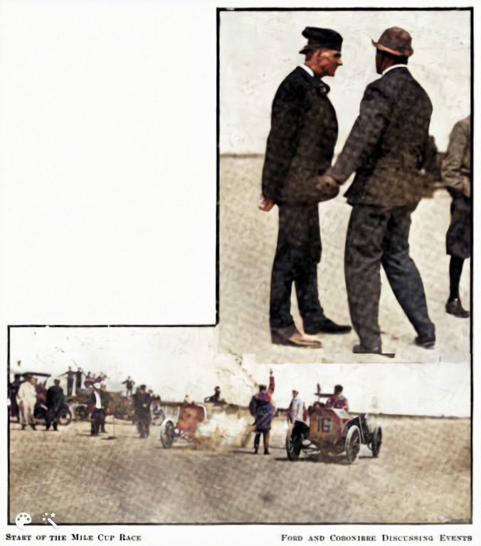 I didn't realize until I saw these photos colorized, but Gaston Plaintiff (left), Ford N.Y. Branch manager, is leaning in, talking with A. L. Campbell, driving his Darracq. I believe this was Henry Ford's last race for time. He beat Campbell and the Darracq, setting a new One Mile for Competition record. However, the Darracq team filed a complaint, arguing that Ford crossed the start line (most races were from a "flying start," with racers expected to cross the start line at the same time, while building speed). The record was disallowed, and Ford didn't set a world record that day.