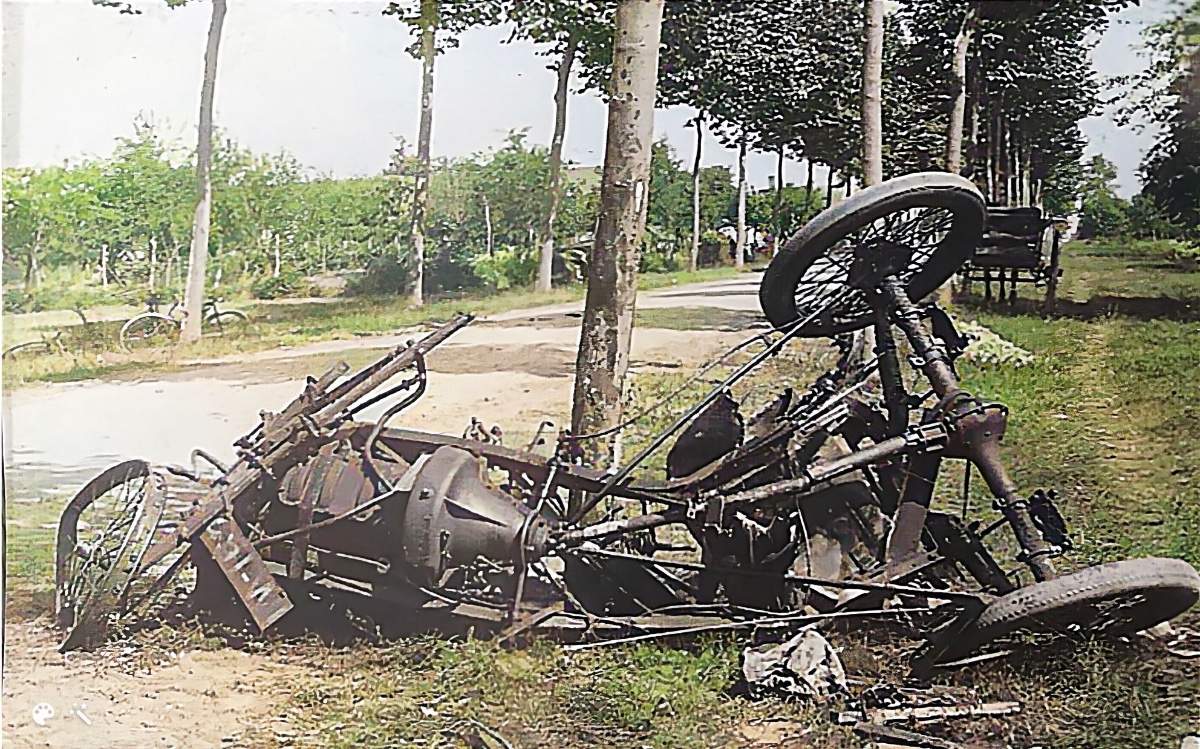 While practicing over the Grand Prix route the week prior, the racer blew a tire, and careened off one poplar tree, ending against another. Depasse wasn't severely injured, but the mechanician riding with him was killed. Witnesses had clocked the racer traveling at 75-80 mph over the course. Two photos of the wreck exist, one taken the night of the wreck, with a Model T in the background: