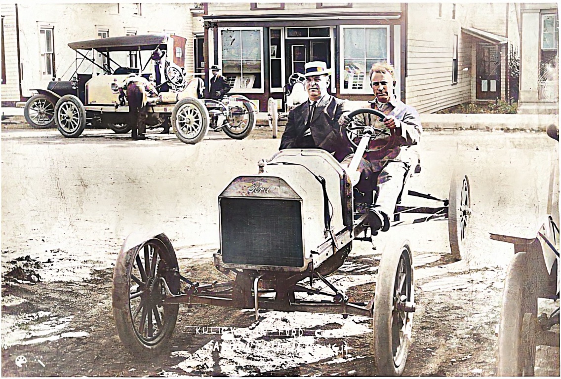 Frank Kulick seated on the large Ford Special racer at Algonquin hill climb, 1911. Ford had two racers at the event and the smaller one is parked across the street facing away: