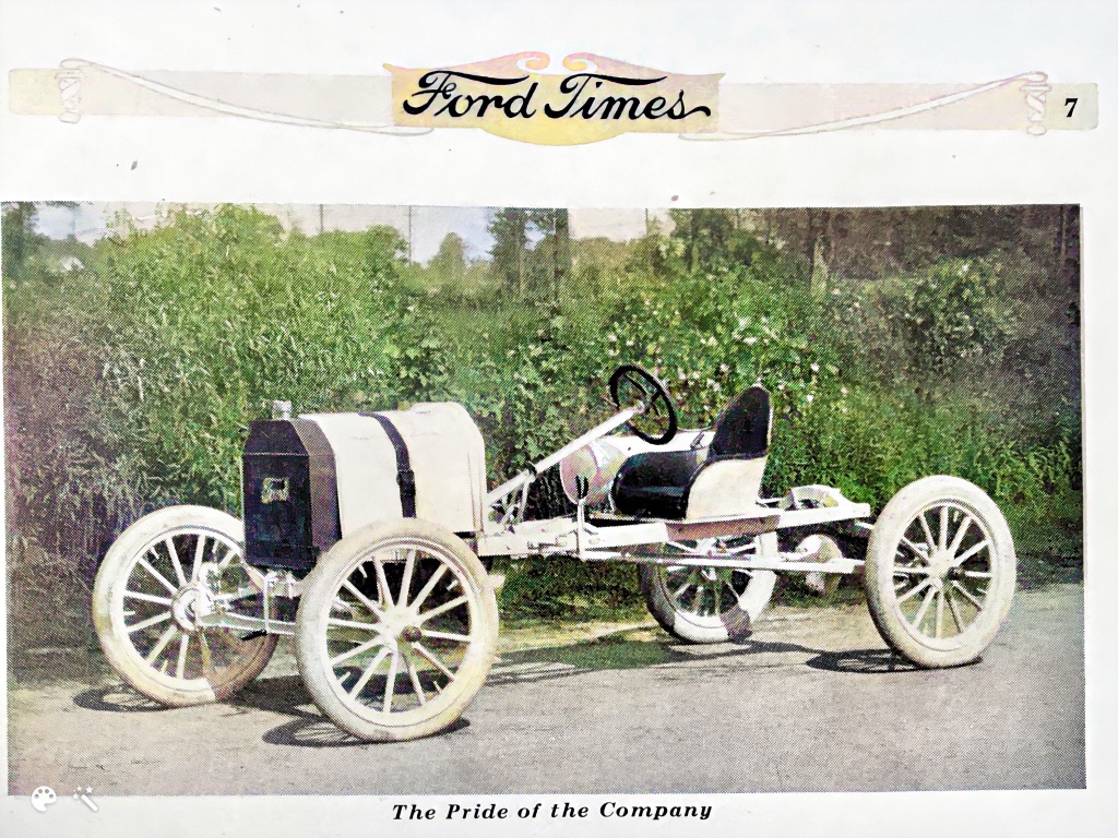 Ford Times photo of Frank Kulick seated in the largest Ford Special racer after defeating the Blitzen Benz in a one mile match race in the fall of 1911 at the Michigan State Fairgrounds: