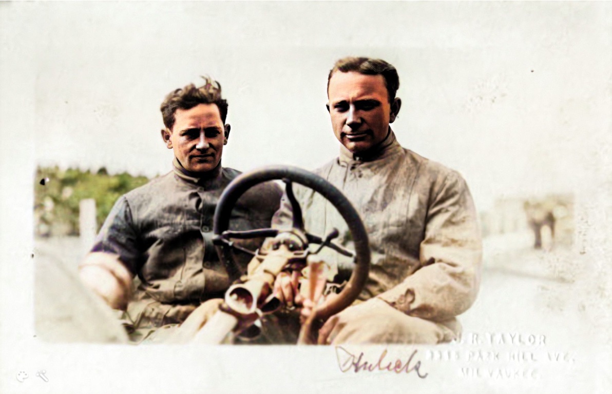 Frank Kulick with mechanician or another driver in Milwaukee before a race in 1912. He pulled out of the race just before it started, and did not race again.