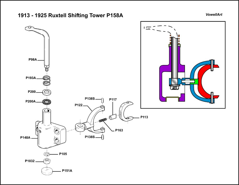 The 26-27 shifter (what I call the Shifting Tower) is a bit beerier than the earlier model, although George Clipner has the early shifter on his 1926 and it seems to work fine. Why the 26-27 needs one like this I've no idea, maybe Dave Little or Mark Chaffin can explain that, me I'm just the guy drawing them.