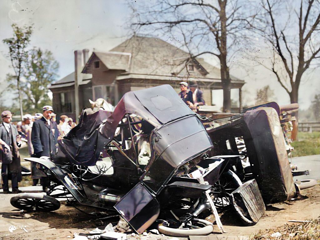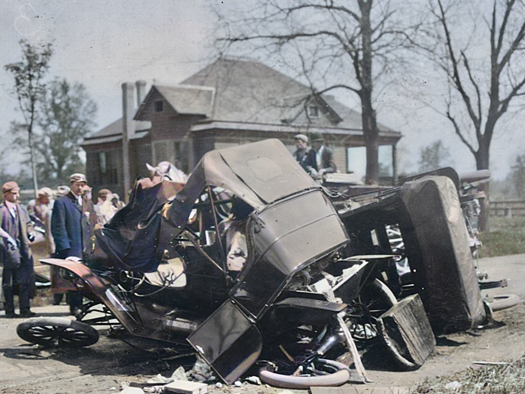 Can anyone colorize the photo of the wrecked 1910? I'd love to see the red pinstripe on the green body.