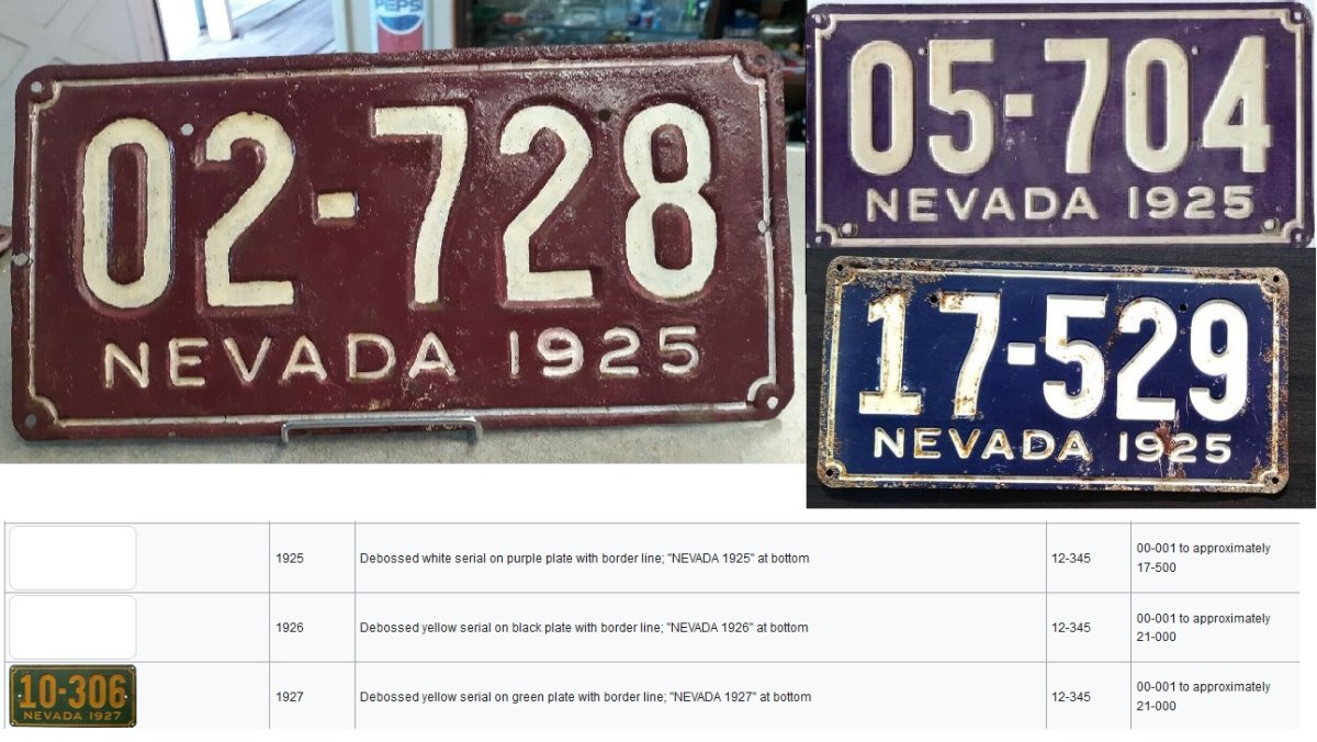 I wondered what the depressed lettering was (referred to as debossed) so I did some google searching. The first plate was redish brown, obviously a restoration attempt, was similar to several other "restorations". The purple/blue plates were from auction sites. The color was also confirmed from https://en.wikipedia.org/wiki/Vehicle_r ... _of_Nevada.