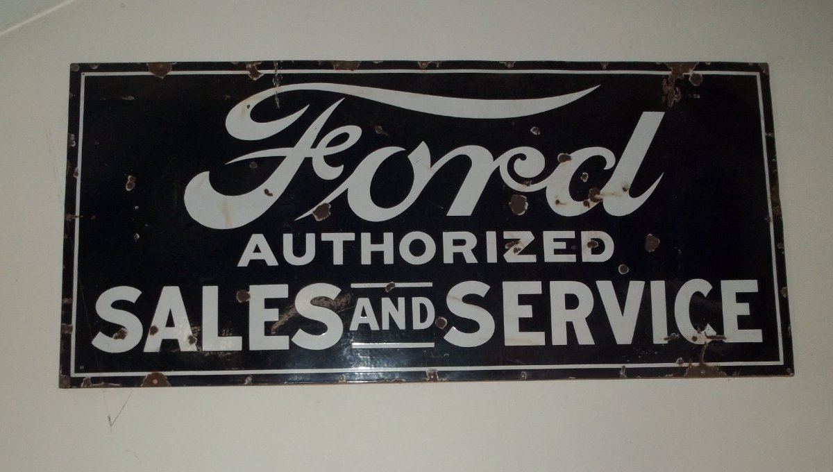 The one thing that most authentic Ford scripts have is the forward loop on the lower cross arm of the F. I don't know for sure but I would say that the sign is a repo. I don't remember seeing any signs like that at swap meets so maybe Ford told them to stop making them and they did. It says on the collector sight, from 1940's and 1950's south eastern states, so in any case not Model T or Model A era and if 1950's Henry never knew about it having passed on in 1947.