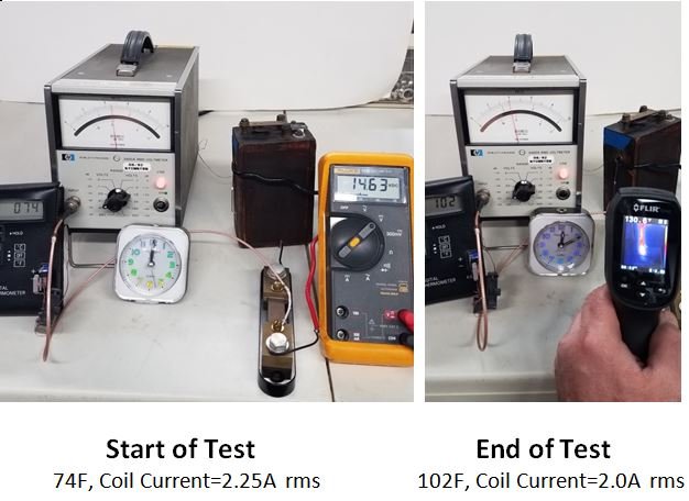 Temperature is monitored via Type-T thermocouple in direct contact with the iron wires of the coil core and by Flir IR thermometer. Elapsed time is measured on an analog clock with second hand.