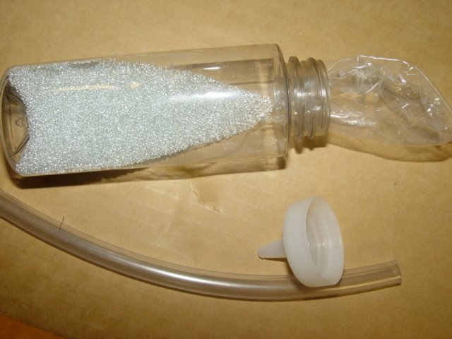 So I pour the beads into the bottle and put on the tubing for bead delivery, slide the tube on the end of the valve stem, and slowy pour the beads in. I have a small hammer to tap on the vice with, that helps get the beads through the stem.