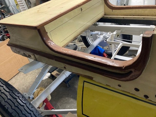 Yes I am acquiring the Ford frame to body mount brackets. I don't have them yet. Not shown in the pictures is a 2 inch by 3 feet length of stock steel on the inside rear part of the body right and left that gives it quite a bit of additional strength. Since I am cloning the 1912 body I can put the mounts where needed on a 26 frame. Still not sure how the skirts are fastened though. Whether I need to scab in some sheet steel on the skirts where it was cut out or some other method?