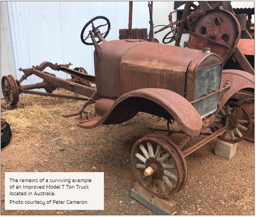 Note while the USA Ford Factories did not produce a production TT with matching demountable wheels all around they were available in New Zealand and Australia. See John Page's excellent article about the "Ford Special Improved Trucks" in Vol 53 no 6 of "The Vintage Ford." You only needed 1 spare. Australia and presumably also New Zeeland continued to sell the standard Ford TT with the gas tank under the seat and the 1925 style hood, and smaller car style front wheels, but also offered the Ford Special version with the matching wheels, gas tank under the cowl, 26-27 style cowl, 26-27 style front fenders and hood, starter etc.