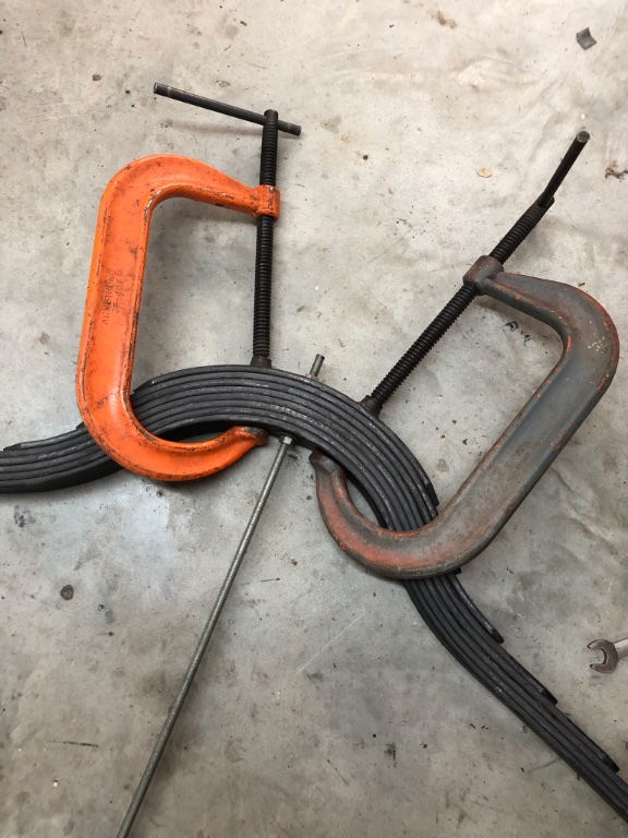 Either prime or apply Slip Plate graphite paint directly on the bare metal. Assemble the spring stack using a length of all-thread rod and two nuts, then use a clamp to the compressed leaves, remove the all-thread, and insert the center bolt. Affix the outboard spring leaf clamps. Then finish paint the entire stack. Low head bolt is ok for later crossmember, just be sure it fits into hole when securing the spring u bolt clamps.