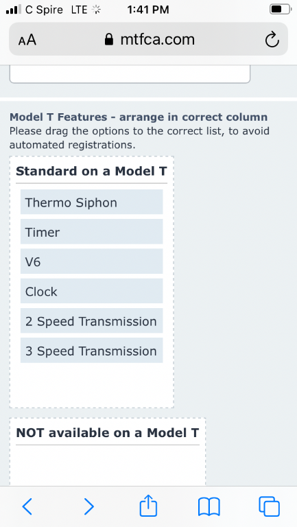 Ha tried to contact the admin and failed the test to submit a message. Apparently a 3 speed transmission, timer, thermo siphon we’re not standard on a model T. The other choices I dragged to the “not on a model T” box. What, me worry.