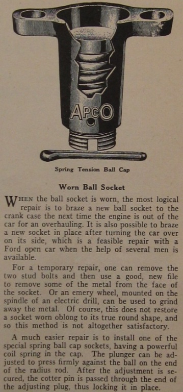 I replaced all of the front end ball joints in my 1926 coupe with APCO ball joint tensioners AKA, “APCO anti-rattlers”, including the wishbone (radius rod) ball (which is bigger than the radius rod anti-rattlers). The concave cup is positioned against the ball and the spring inside applies constant tension to the ball of the joint no matter how worn the ball gets which is better than having a loose ball rattling around inside the non adjustable stock ball joint. Just need to keep it greased. My APCO ball joints are all vintage 1920’s, I found on eBay, where they are pretty common and usually easy to find with the keywords “APCO Ford”, but new ones are sold at Lang’s and Snyder’s. With these, I doubt if there is much you need to replace on your front end. I would prime and paint all the parts and assemble. Any bushings that are overly loose, you need to consider replacing with new bushings but if there is little play, you can lubricate and leave it as is. Jim Patrick