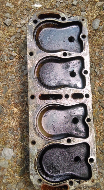 Note the comparison of the long sunken oval portion of where the gasket failed. The Reeder head has a long oval hole, no other cylinder head put on the Ford has this feature. The engine blocks do not have matching feature.