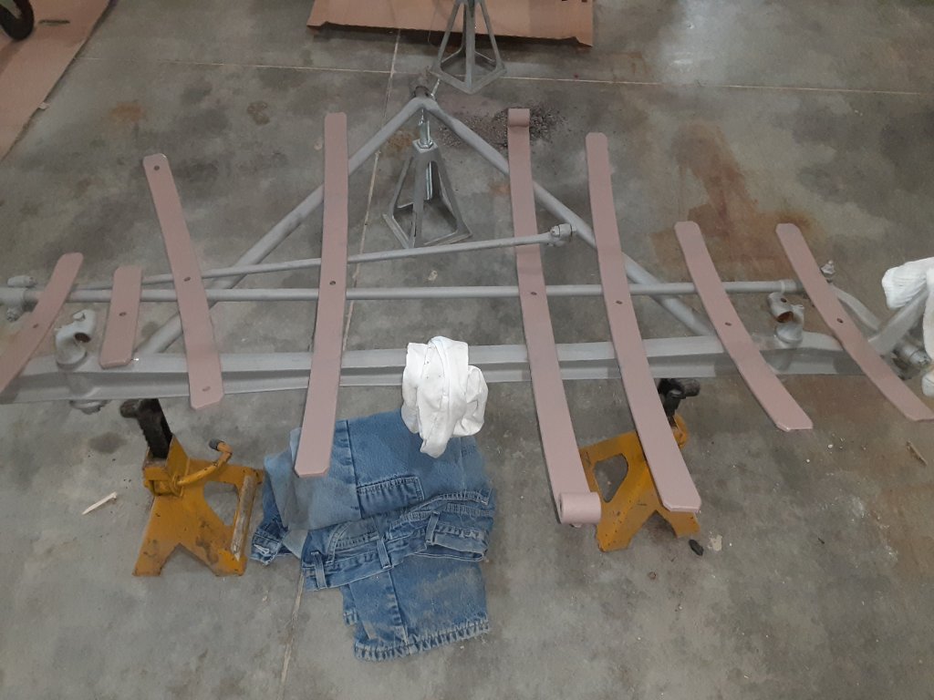 I have had the springs blast cleaned to bare metal and have applied a Rust-Oleum primer as shown in the attached photos. I plan to paint each leaf with a Rust-Oleum satin. I will then brush a graphite slip paint to the bottom of each leaf, except the bottom leaf.