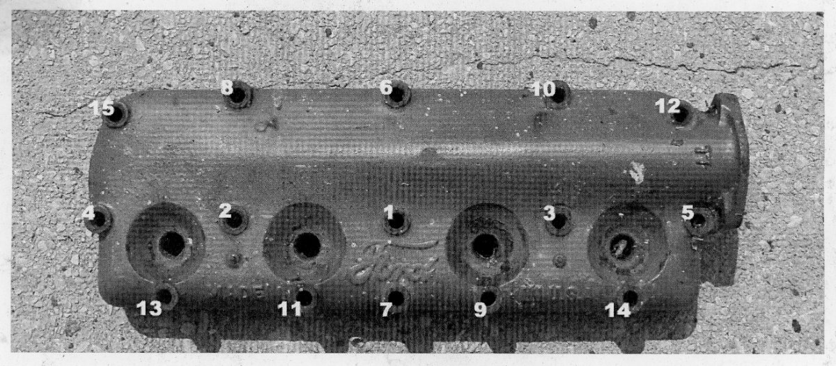 The proper sequence is needed for the Ford cylinder head bolt tightening. The center bolts must be tightened down first. This is because the head gasket is so narrow between cylinders 1-2 and 3-4. And for best results of a long living gasket, the cylinder head and block surface should be flat, preferably surfaced to be totally level.