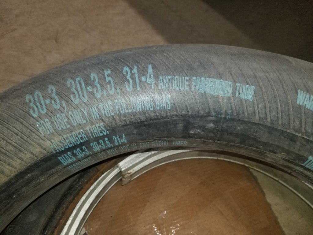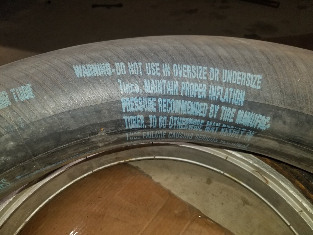 I went to the rear flat and inflated it to 35 psi. 1st thing on the list since my forehead is still sore, was to spit test the valve core. No leak there. I removed the tire and tube and found a small cut or crack at the base of the valve stem. Ah ha I found it. NO I DID NOT! I inflated the tube and found no leak anywhere. I inflated both tubes and let them stand there. I turned out the lights and went to the house at this point. Tomorrow I will take them for a swim in the horse tank. Same print but no name. Made In USA on both tubes. These tubes came with the truck when I got it. In fact I have never had the rear tubes out.