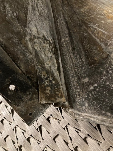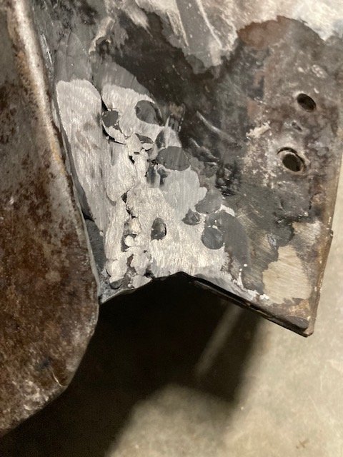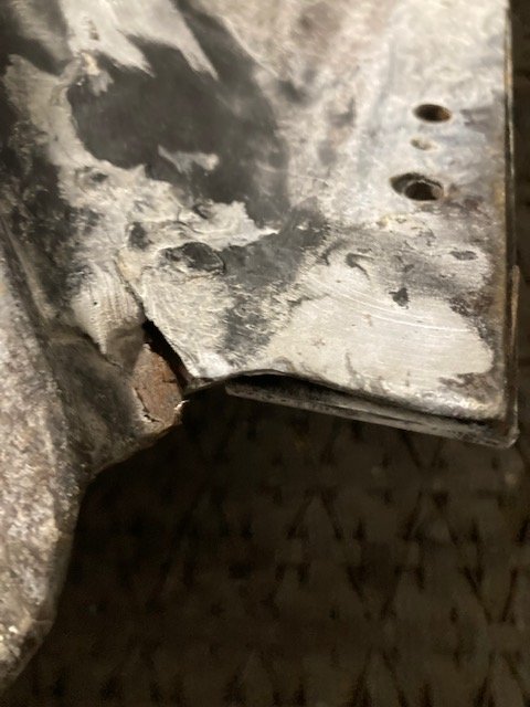I have 2 used 1914-15 fenders. In preparation for painting one has been paint stripped and wire wheeled to get paint and surface rust off, then Metal Prep phosphoric acid treatment to keep them from flash rusting. That is the white residue seen in the picture. Flash rusting occurs quickly in hot, humid, Houston if you don't coat with something. The fenders are in fair condition but I notice that they both have spot welded patches on the underside where the two pieces of fender meet. One had clearly started to crack and was patched and has a light coat of body filler. The other is slightly cracked but has patches on the under side as well. Should I try to weld the crack shown in the second picture or leave it alone?