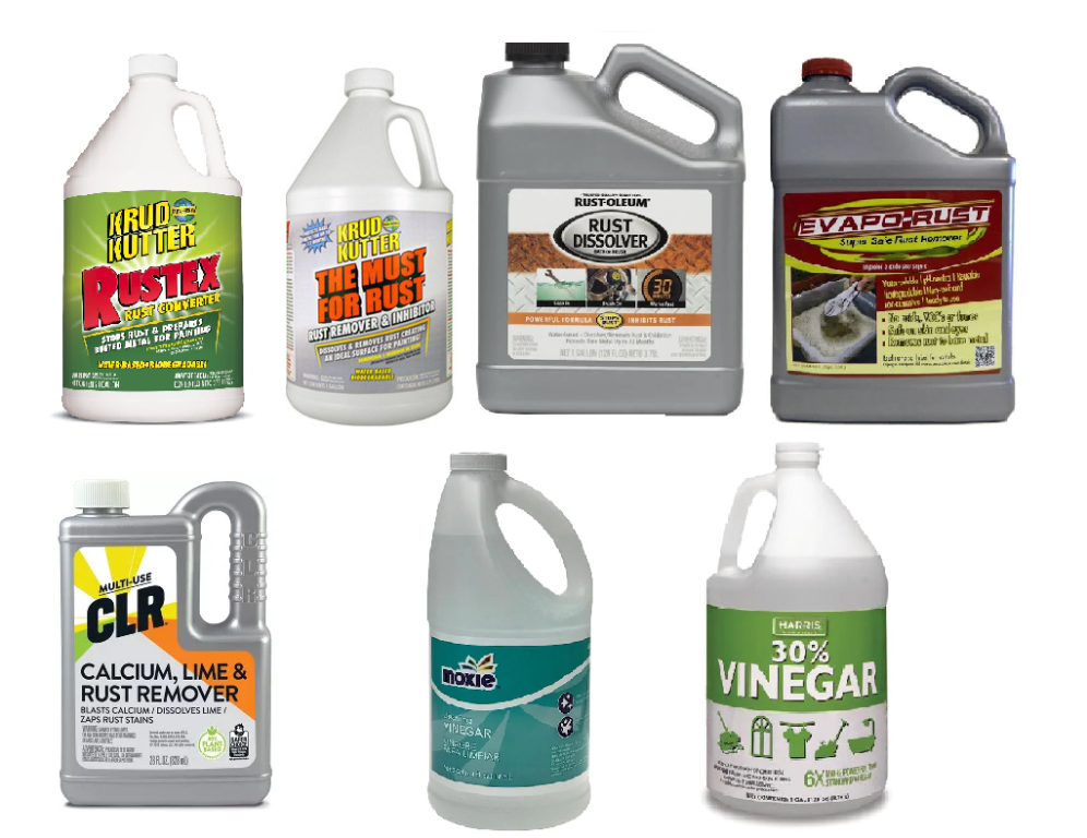 I have used all of the pictured products for rust removal except for the 30% Cleaning Vinegar. I did not find CLR to do a good job on rust but use it to clean (short soak) Copper and Brass. Rustoleum makes the Krud Kutter products and as far as I can tell "The Must for Rust" and "Rust Dissolver" are the same solution in a different container. All 3 of these products are phosphate based. I did an experiment with RUSTX, THE MUST FOR RUST. EVAPORUST and CLEANING VINEGAR using similar rusted items. All 4 produced the similar results, however EVAPORUST took the longest and the Cleaning Vinegar began to show some oxidation after a few hours. My preferences are the Krud Kutter products and for something like a head I'd used Cleaning Vinegar because it does a great job and is very inexpensive and no need to seal the metal as the other products claim to do (going to try the 30% some time.) To make these products last longer, it helps to de-grease and remove dirt off the parts first. Also transferring the solution after use to another clean container leaving the residue behind will also help.