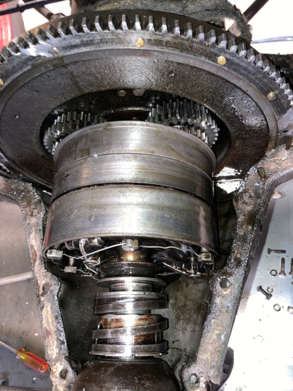 Get a new set of 3 band return springs. They are typically shrunk from use. Washers are not stock. See manual. Low drum lining is gone to the metal band. It has scraped the drum. A little smoothing may be useful with emery cloth. Prevent the filings from getting into the trans. Output plate bolts wired in pairs. Not over the fingers.