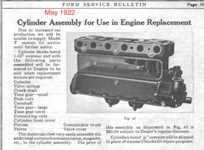 Begs to ask the question........" unable to supply Model T motors for service until further notice "......so, did dealers get from branches finished numbered motors? .....were these engines, fitted with the parts noted, marked with serial numbers? They weren't just bare blocks, with all these parts furnished. Who can know