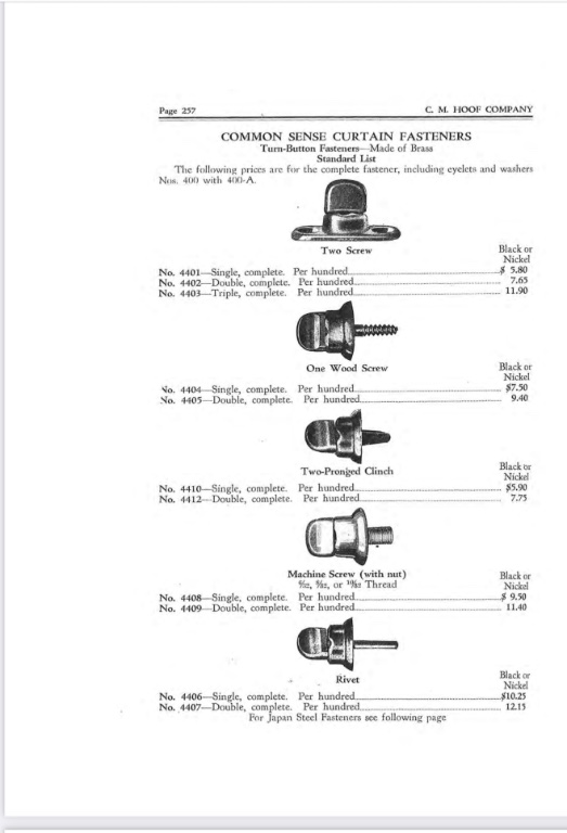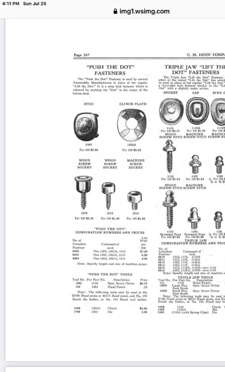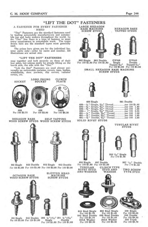 Thanks to keith, I’ve corrected my post. Here are some samples, I’m sure there are others. The very early T and pre-T used similar fasteners to the Murphy, but different. I think appropriate for very early T, and certainly pre-T autos. I don’t have an example of a Murphy brand to show, but are the same and interchangeable with the Common Sense brand. Then, Lift-the-Dot , which is a brand and encompasses other fasteners, also called lift-the-dot, and finally post snaps. These also likely have a name, don’t know what it is, but generally these last two are common in the model A Ford and that era.