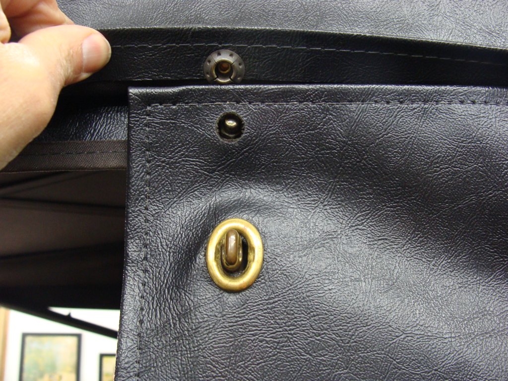 The stud of the Anzo passes through a hole in the side curtain and the top flap "snaps" onto the stud, sandwiching the side curtain in place.